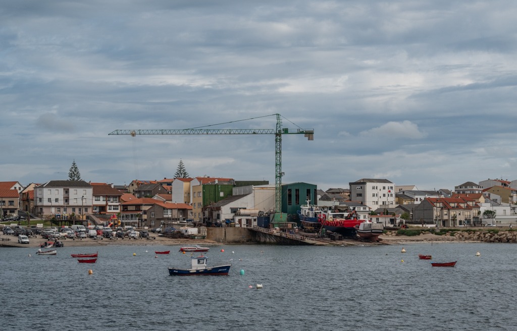 Dort angekommen, erkennen wir, dass er kein Schmuckstück an Galiciens Küste ist. Geschützt vom Damm zur Insua Primeira, von dem wir gerade kommen, und zwei Molen, die weiter innen liegen, ist er vielmehr ein zweckmäßiger Hafen für die hiesigen Fischer. Nebenan befindet sich eine kleine Werft, deren ganzer Stolz ein alter Turmdrehkran ist, der den gesamten Ort überragt.